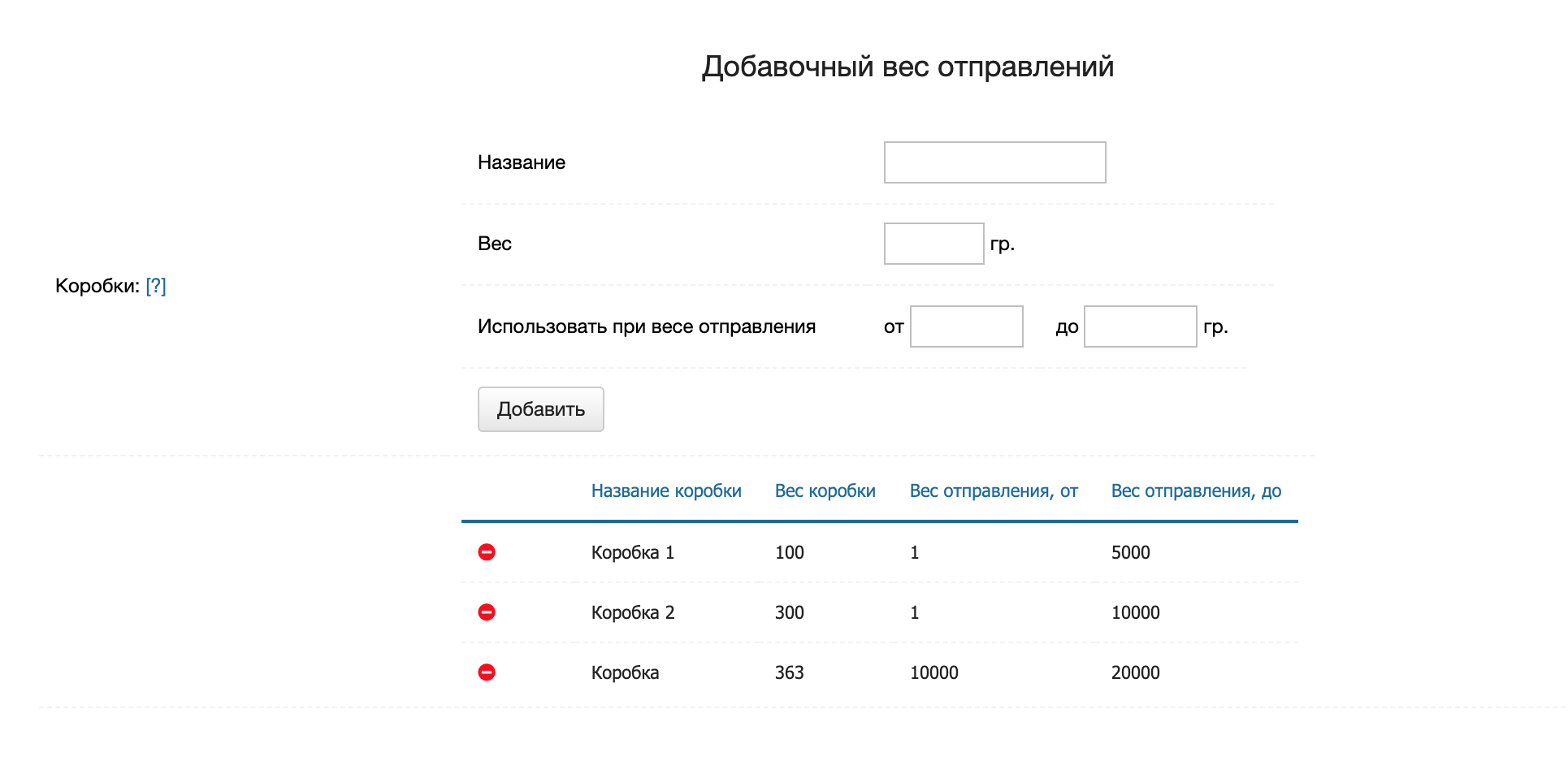 Данные настройки отвечают за учет веса упаковочных материалов (коробок) в суммарном весе отправления.