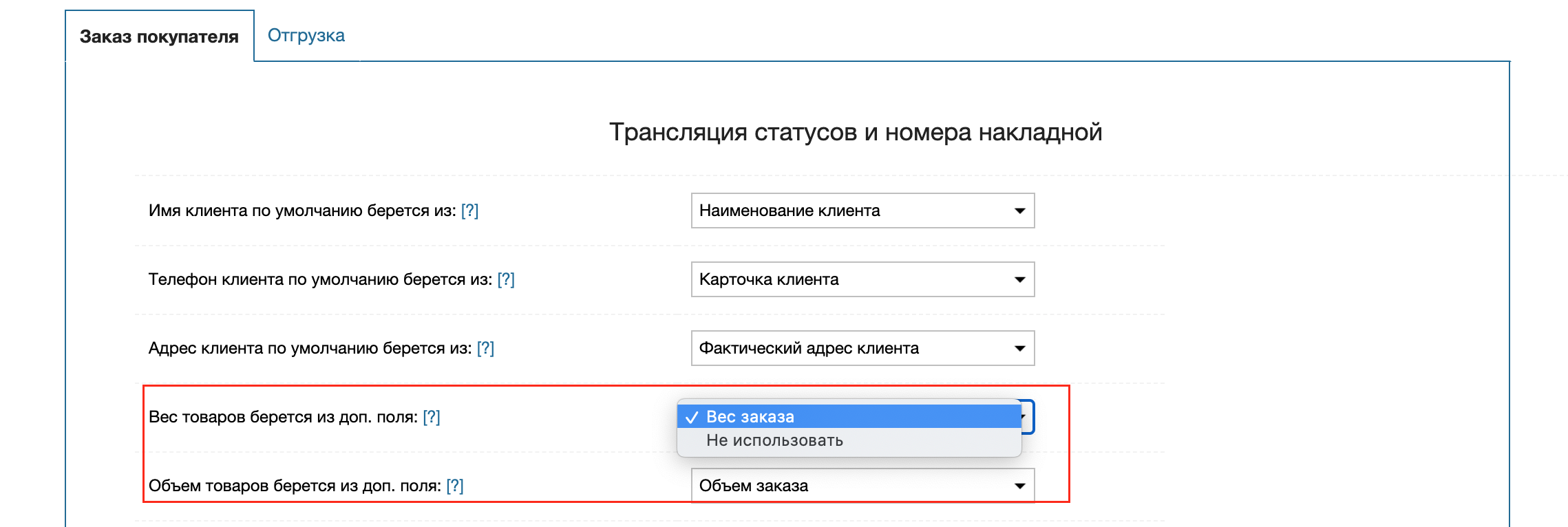 - Использовать габариты и вес позиции, если они установлены в МойСклад (доп. поля). В этом случае, приложение будет брать значения веса и габаритов из предустановленных доп. полей документа, если значения в них указаны