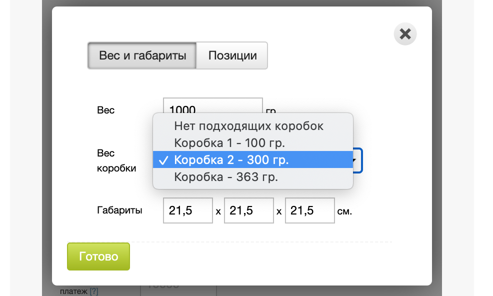 Во всплывающем окне доступно редактирование веса, габаритов, стоимости и наложенной суммы.