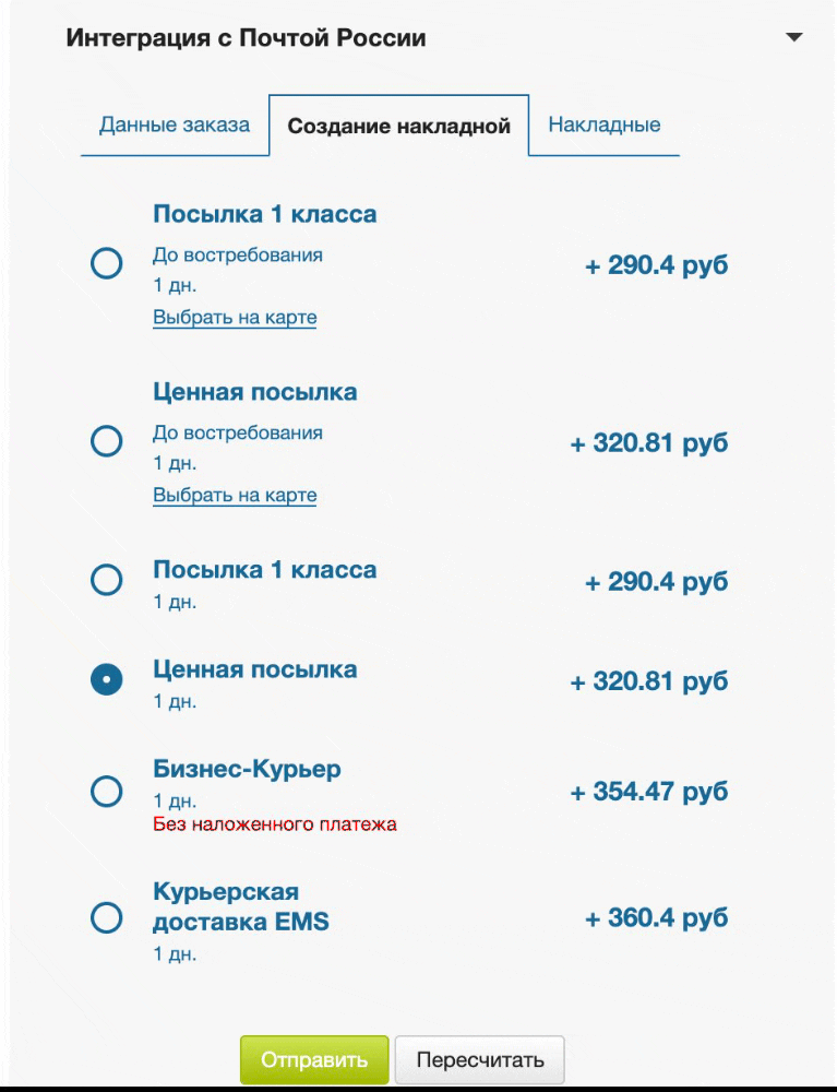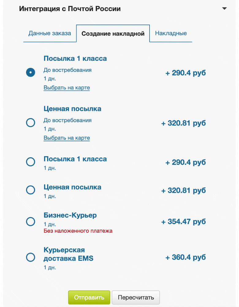 Помимо стоимости в расчетной части доступны выбор ОПС на карте, и контрольные сроки доставки по каждому из тарифов.