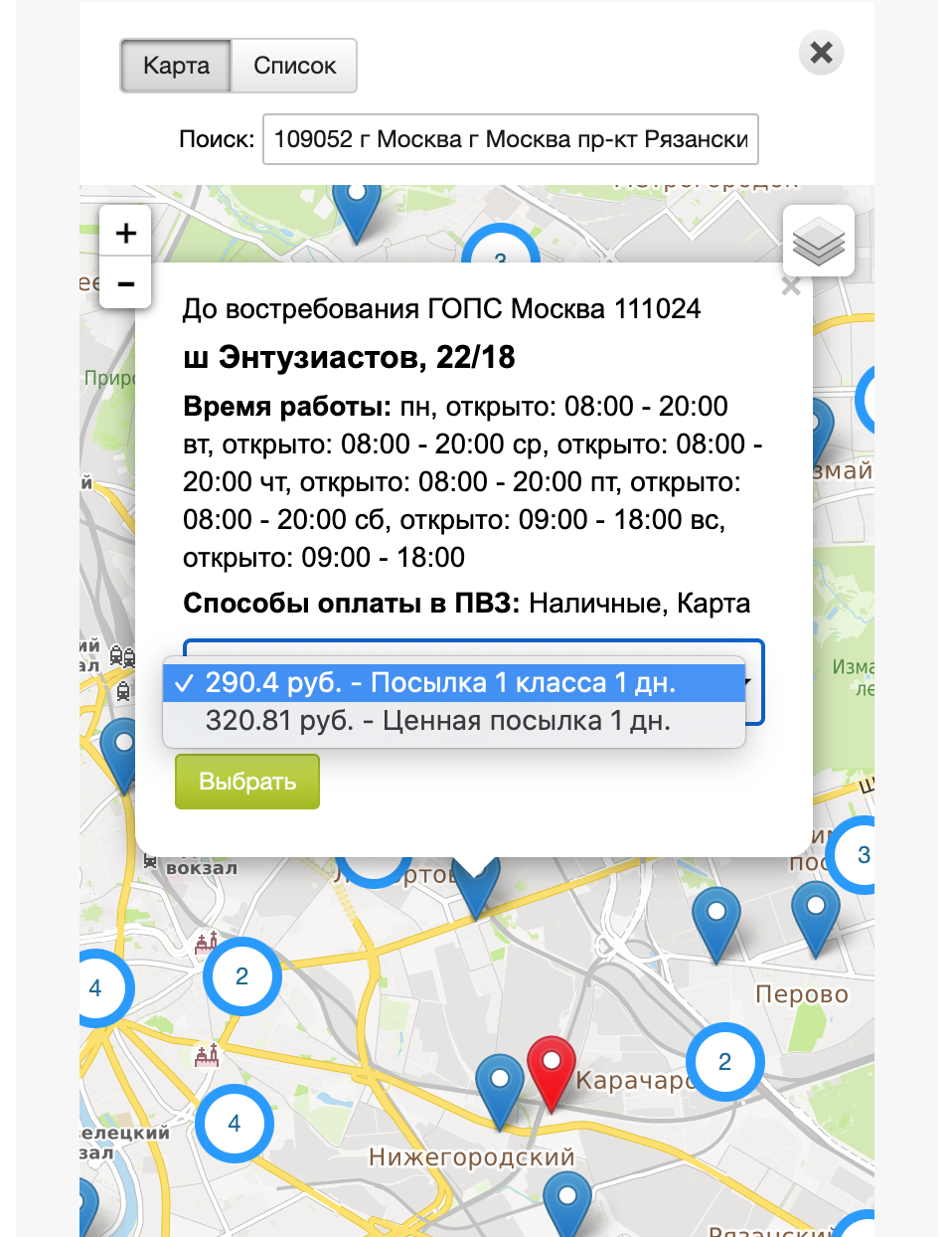 У каждой точки опционально отображаются на карте тарифы доступные для нее и сроки доставки. Адрес клиента подсвечивается красной меткой для удобства выбора ближайшего ОПС.