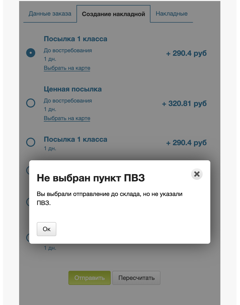 Если пользователь не выберет точку ОПС при заказе по тарифу До востребования, он получит сообщение с предупреждением, а заказ не оформится.