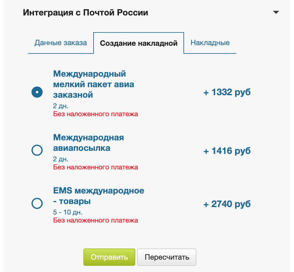 Если в городе получателя недоступен Наложенный платеж, пользователь получает уведомление при расчете цены, а опция Наложенный платеж переключается в значение "Без наложенного платежа" автоматически