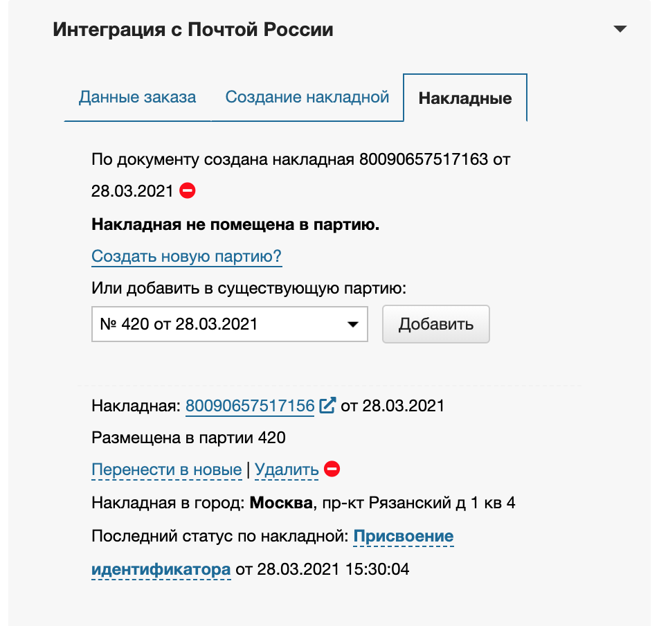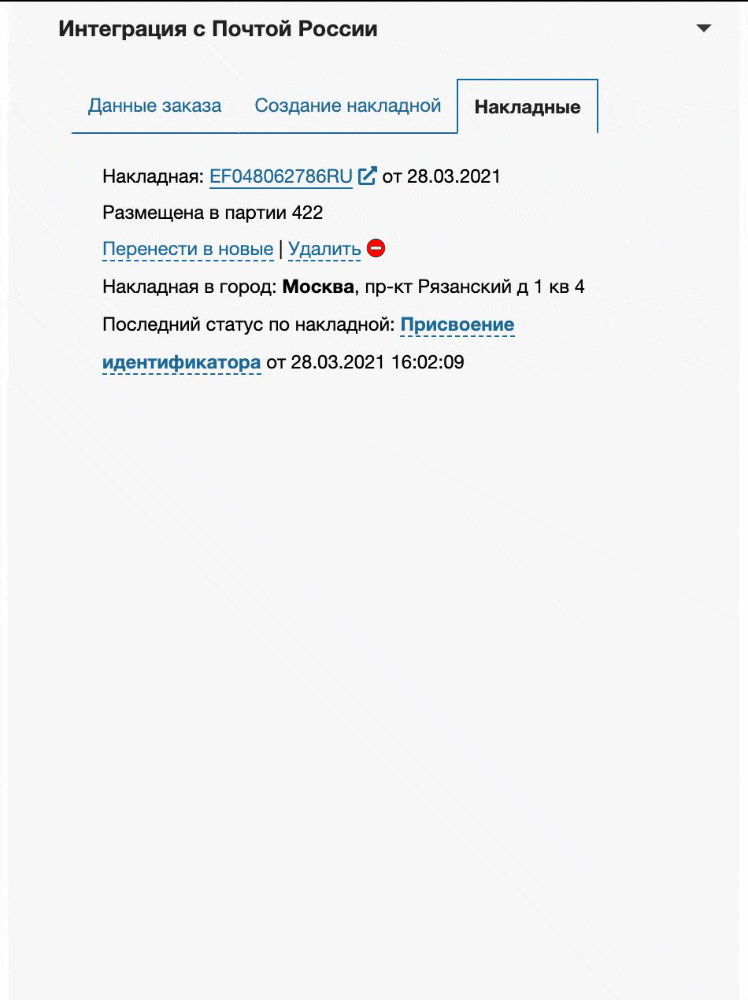 В этой части виджета выводятся все созданные по данному документу (заказу покупателя или отгрузке) накладные Почты России, а также их последний статус, краткая информация.