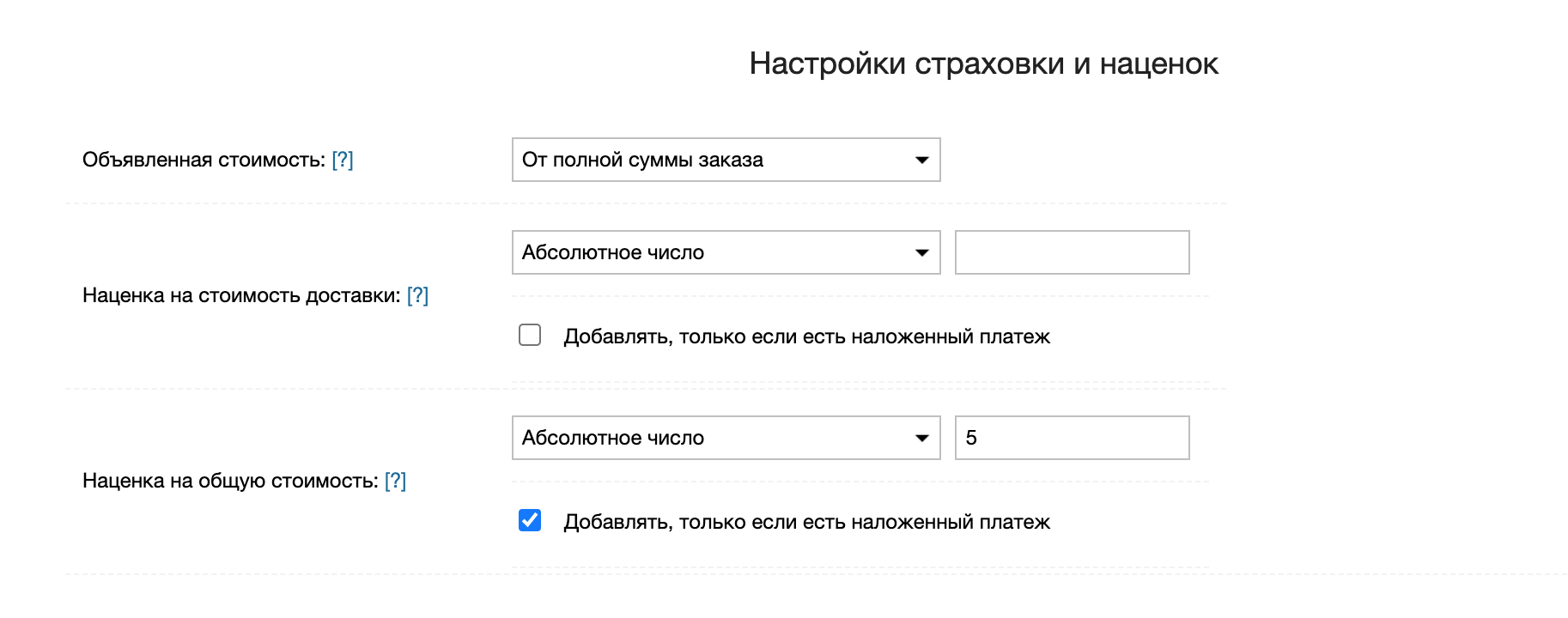 Включенная галочка Доп. сбор за доставку включает стоимость пересылки в объявленную стоимость и наложенный платеж