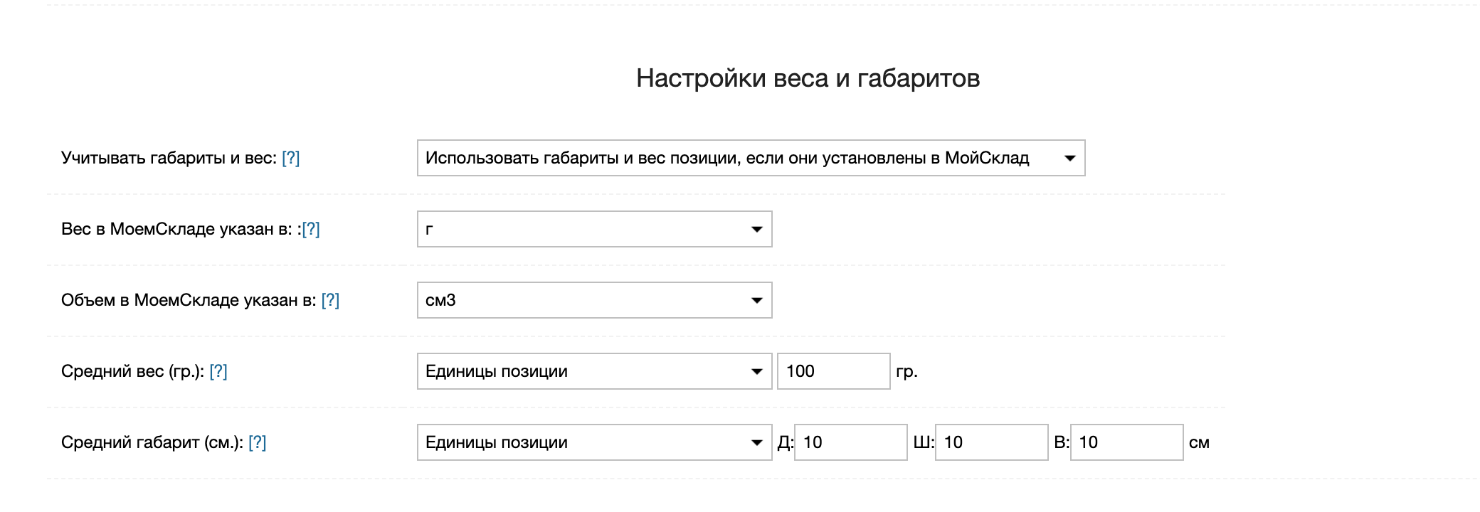 Данные параметры используются приложением, если вес или объем не задан в карточке товара МойСклад.