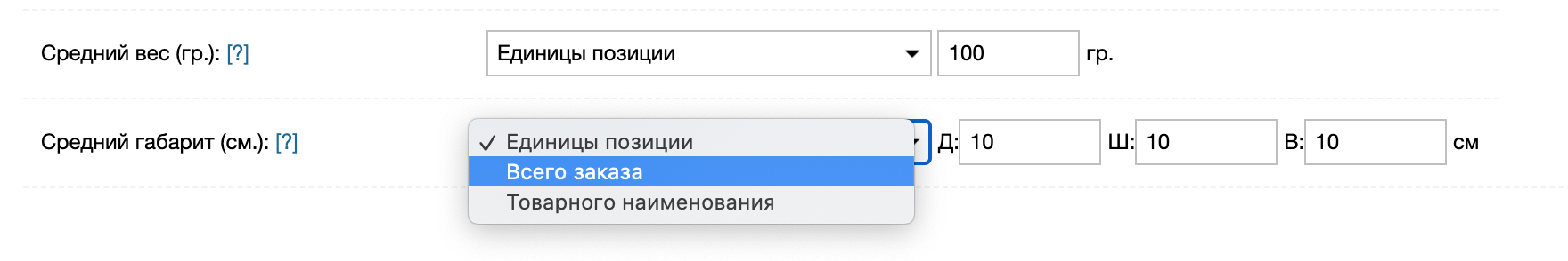 - Всего заказа. Если вы указываете средний вес на заказ 3000гр, то приложение поделит этот вес на количество позиций. Например, заказе у вас 3 товарных наименования по 1шт, но у лишь у одного нет значения веса - приложение посчитает вес этой позиции как 3000 гр / 3 = 1000гр.