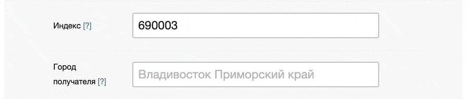 Если адрес не задан, индекс можно указать вручную, вводя в поле индекс или название города получателя.