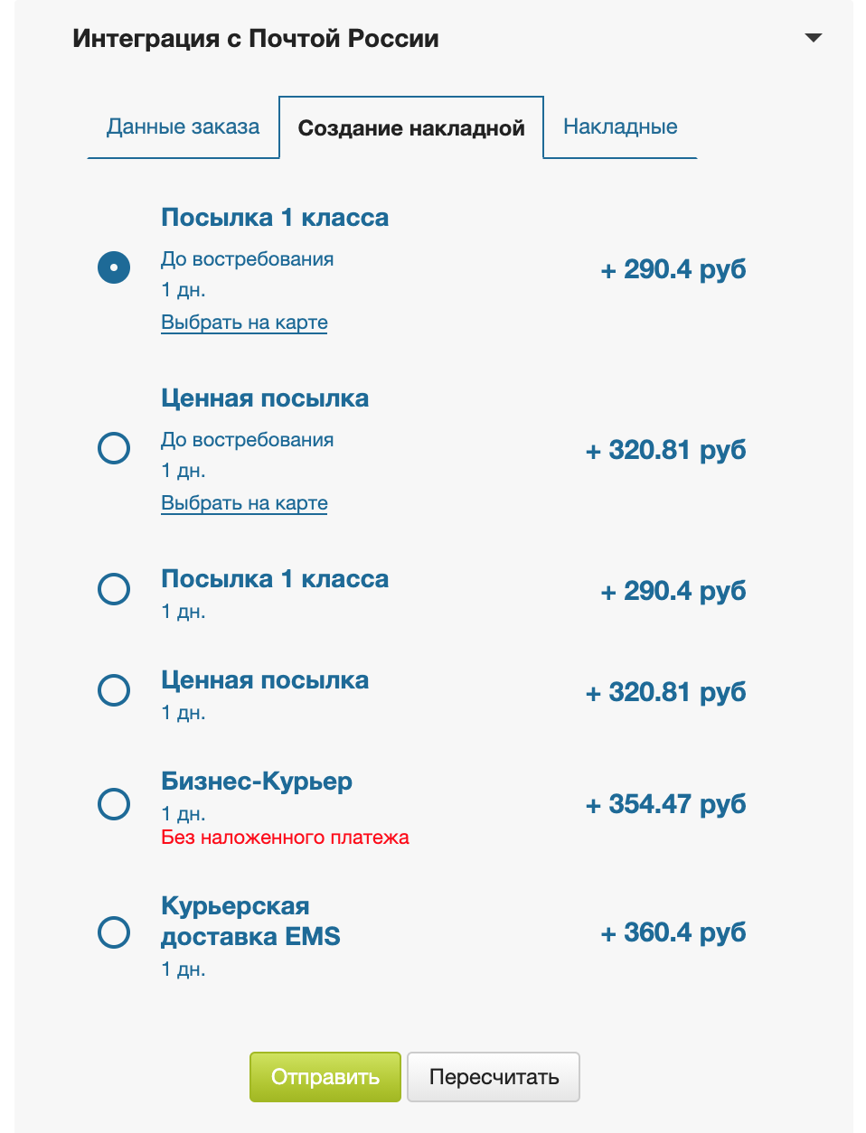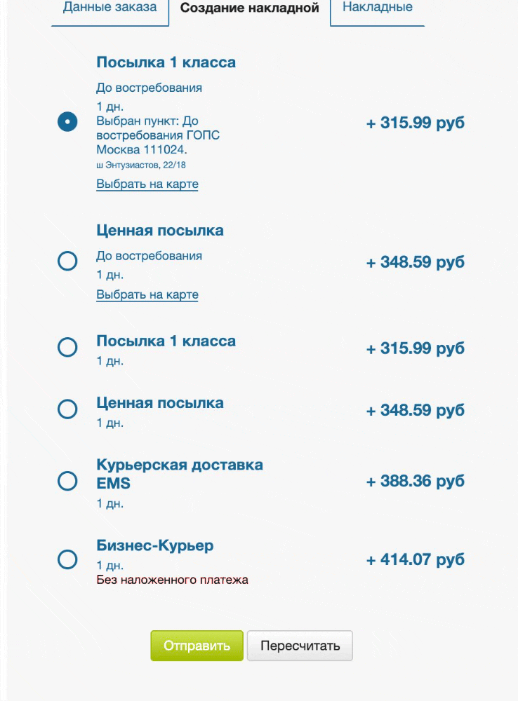 Помимо стоимости в расчетной части доступны выбор ОПС на карте, и контрольные сроки доставки по каждому из тарифов.