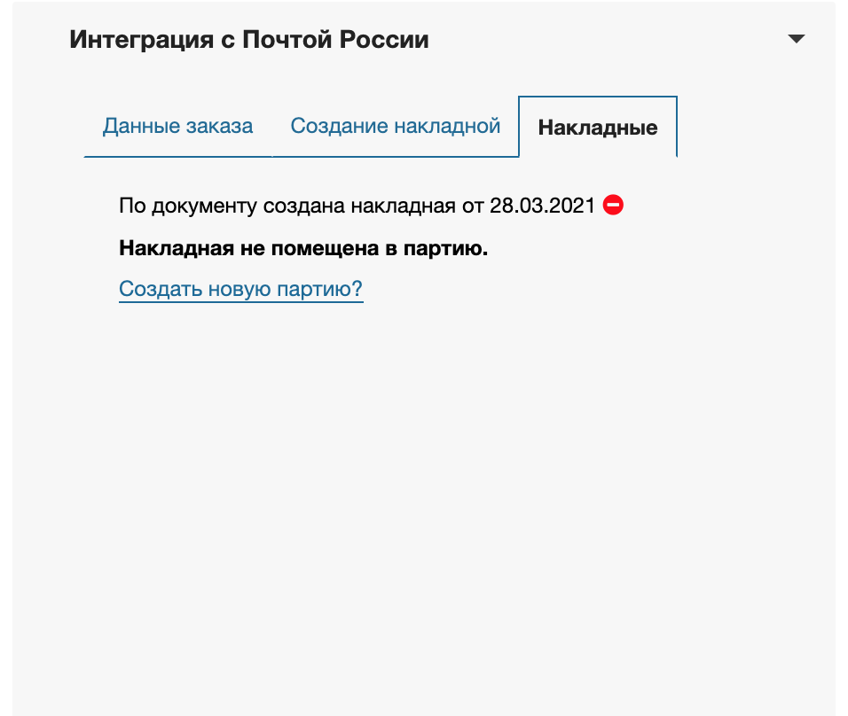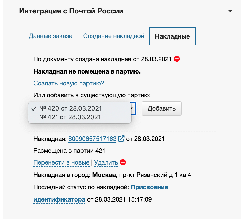 В этой части виджета выводятся все созданные по данному документу (заказу покупателя или отгрузке) накладные Почты России, а также их последний статус, краткая информация.
